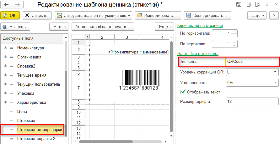 Для работы с ценниками автопроверки необходимо в «1С:Рознице» создать шаблон ценника с использованием штрихкода автопроверки и указать значение QRCode для реквизита Тип штрихкода.
