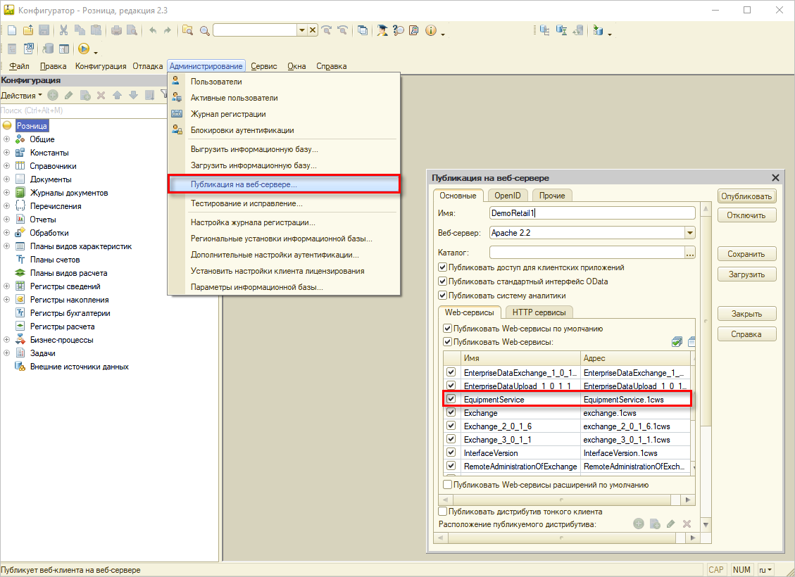 Следующим шагом публикуем web-сервис в программе «1С:Розница». Для этого нужно открыть программу в режиме конфигуратора и в разделе Администрирование выбрать команду Публикация на веб-сервере. В открывшемся окне необходимо опубликовать веб-сервис EquipmentService.