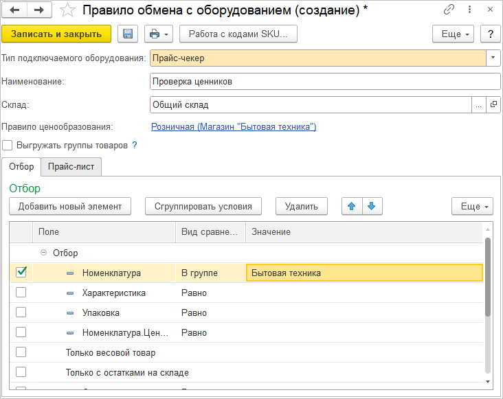 В группе Отбор можно настроить отбор списка выгружаемых товаров. Всем выгружаемым товарам необходимо создать SKU (идентификатор товарной позиции). Это можно выполнить не выходя из данной формы с помощью команды Работа с кодами SKU (эту же команду можно выполнить в разделе НСИ - Сервис).