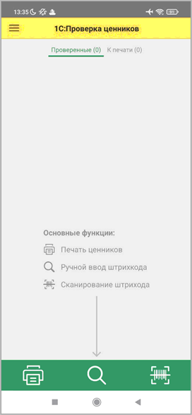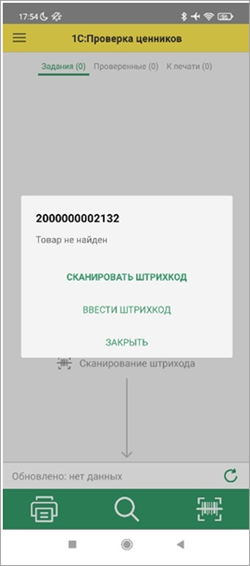 Сканирование штрихкода начинаем по команде Сканировать штрихкод. После сканирования штрихкода приложение проверяет наличие номенклатуры с таким штрихкодом в прайс-листе. Если товарная позиция не найдена, то предлагается повторить операцию с помощью команд Ввести штрихкод и Сканировать штрихкод.