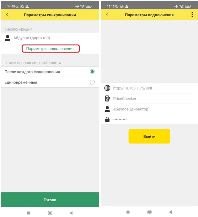 Для изменения параметров подключения сначала необходимо выйти из текущего подключения, тогда все данные в приложении будут удалены. После выхода можно вводить новые параметры подключения.