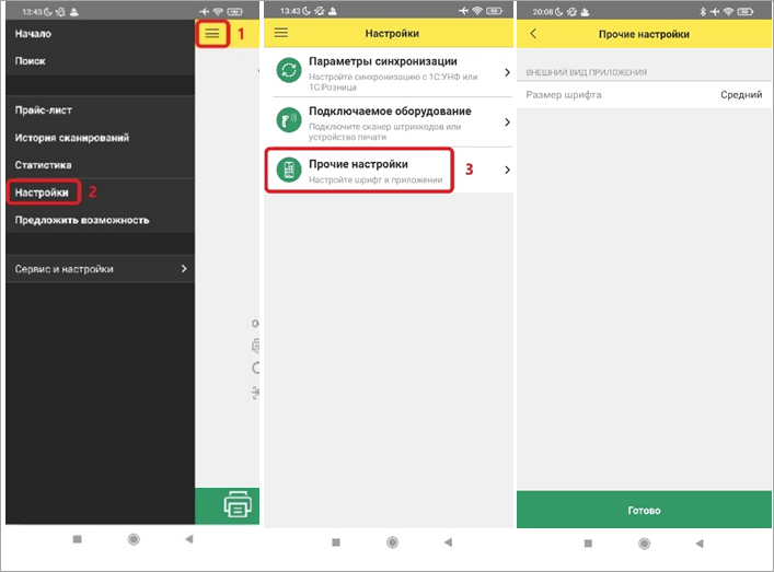 Для удобной работы в приложении можно выбрать размер шрифта (Настройки-Прочие настройки). Настройка шрифта влияет на масштаб отображения всех надписей.