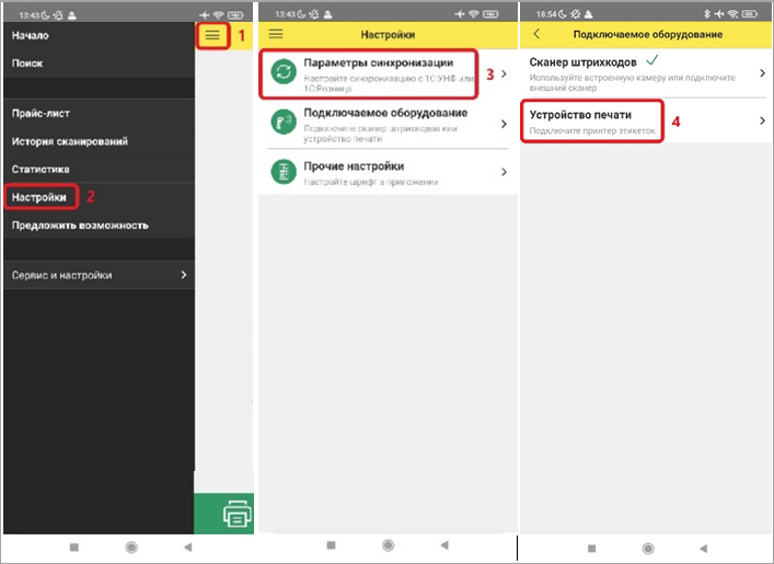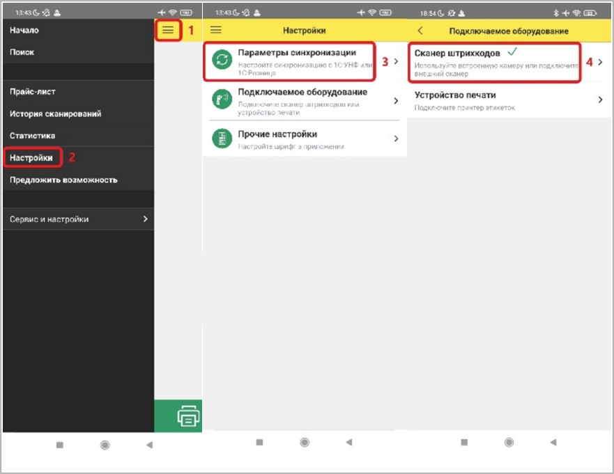 Для подключения сканера открываем меню Настройки - Подключаемое оборудование и выбираем Сканер штрихкодов.