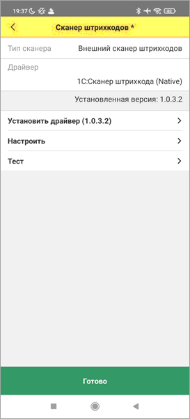 Устанавливается поставляемый вместе с приложением драйвер «1С:Сканер штрихкода (NativeApi)».