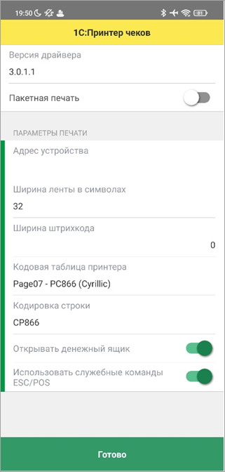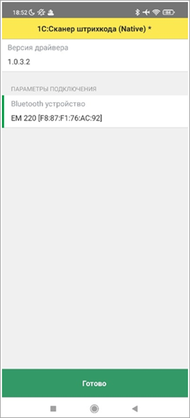 При подключении устройства с помощью драйвера «1С:Сканер штрихкода (NativeApi)» по кнопке Настроить указываем параметры настройки драйвера оборудования. Будет произведен поиск доступных устройств. Если в зоне действия Bluetooth находятся несколько включенных устройств, то будет выведен список. Выбираем устройство для подключения и завершаем настройку по кнопке Готово.