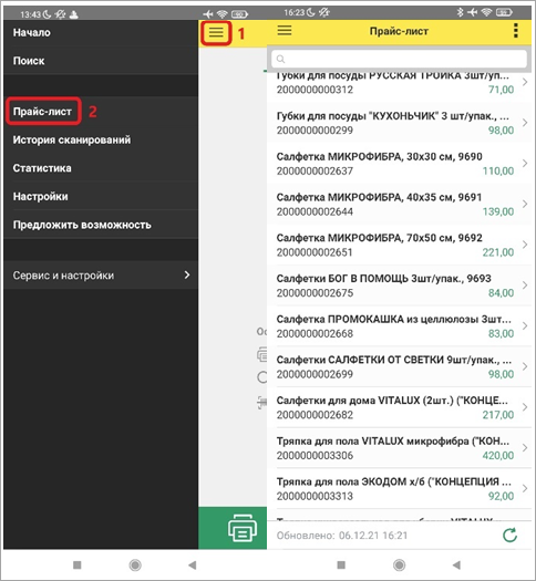 В приложении поддерживается справочник номенклатуры. Список номенклатуры и установленных цен можно посмотреть в основном меню Прайс - лист.