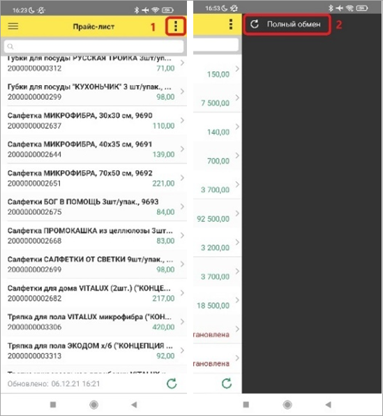 Загрузку изменений производим по команде Обновить на странице прайс-листа или на начальной странице. При первом обмене загружается полный прайс-лист.