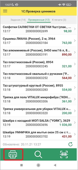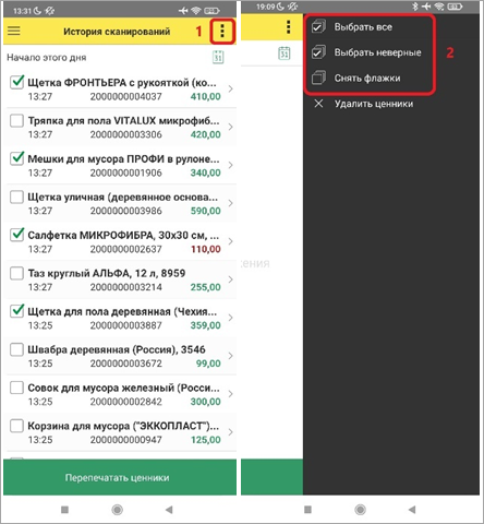 Ценники со статусом «Правильный» перемещаются в историю сканирования без печати.