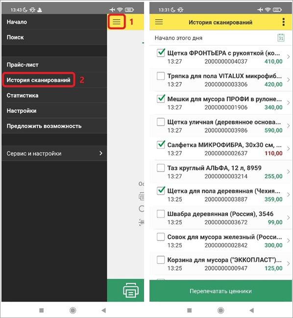 На форме можно просмотреть проверенные ценники, выбрать период для просмотра истории сканирования. Также есть возможность перепечатать ценники за период по команде Перепечатать ценники. Выбрать ценники доступно с помощью команд из дополнительного меню.