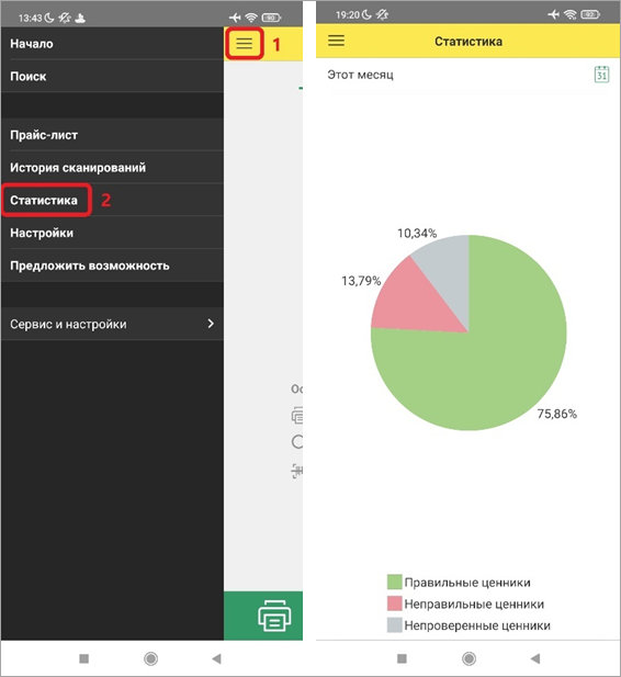 Результаты представлены в виде круговой диаграммы, где видны «Правильные ценники», «Неправильные ценники» и «Непроверенные ценники». Статистику можно посмотреть на определенную дату.