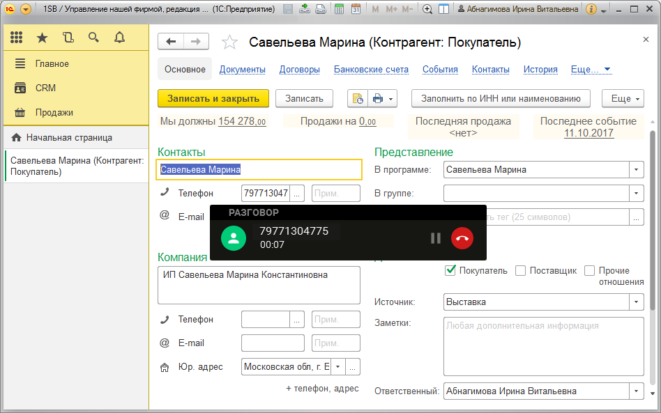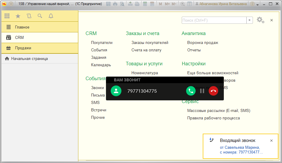 Звонок в 1С:УНФ будет принят автоматически. Всплывающее сообщение оповестит пользователя о том, что поступил звонок.
