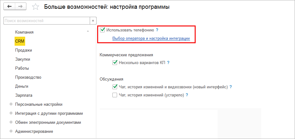 Если используется платформа 1:Предприятие 8.3.11 (или выше), при включении телефонии, система попросит вас зарегистрироваться и автоматически активирует опцию Автоматическая обработка звонков (группа настроек Обработка звонков).