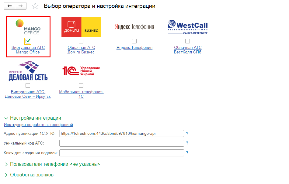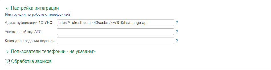 Заполнение настроек пользователей телефонии обязательно для соединения с облачной АТС. Данные о пользователях в 1С:УНФ должны соответствовать данным, указанным в личном кабинете оператора.