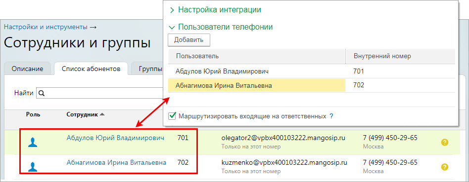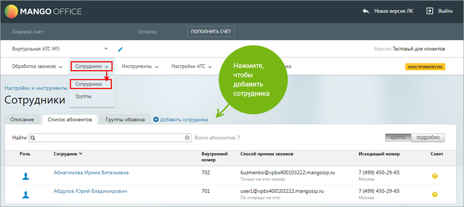 Не забудьте заполнить список сотрудников и их внутренние номера в разделе Сотрудники личного кабинета MANGO OFFICE.
