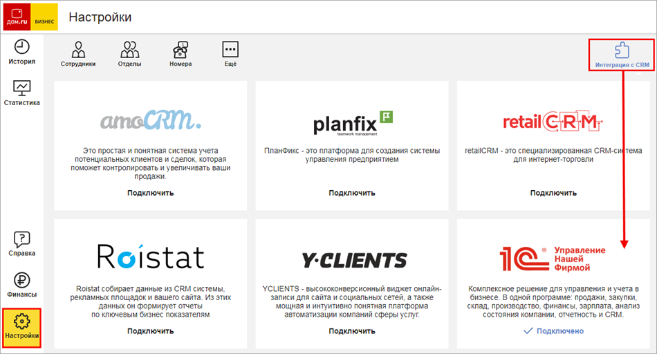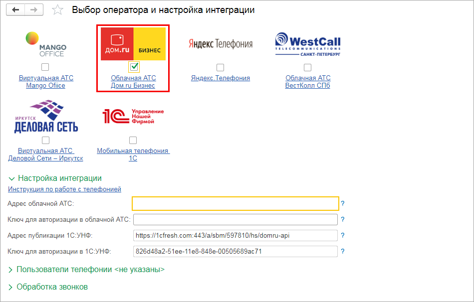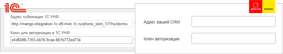 Данные для заполнения можно получить в личном кабинете облачной АТС Дом.ru Бизнес. Откройте личный кабинет и перейдите в меню Настройки - Интеграция с CRM - 1С:Управление нашей фирмой.