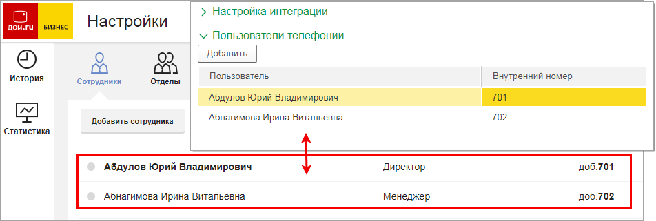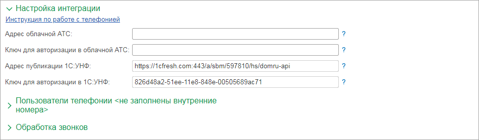 Заполнение настроек пользователей телефонии обязательно для соединения с облачной АТС. Данные о пользователях в 1С:УНФ должны соответствовать данным, указанным в личном кабинете оператора.