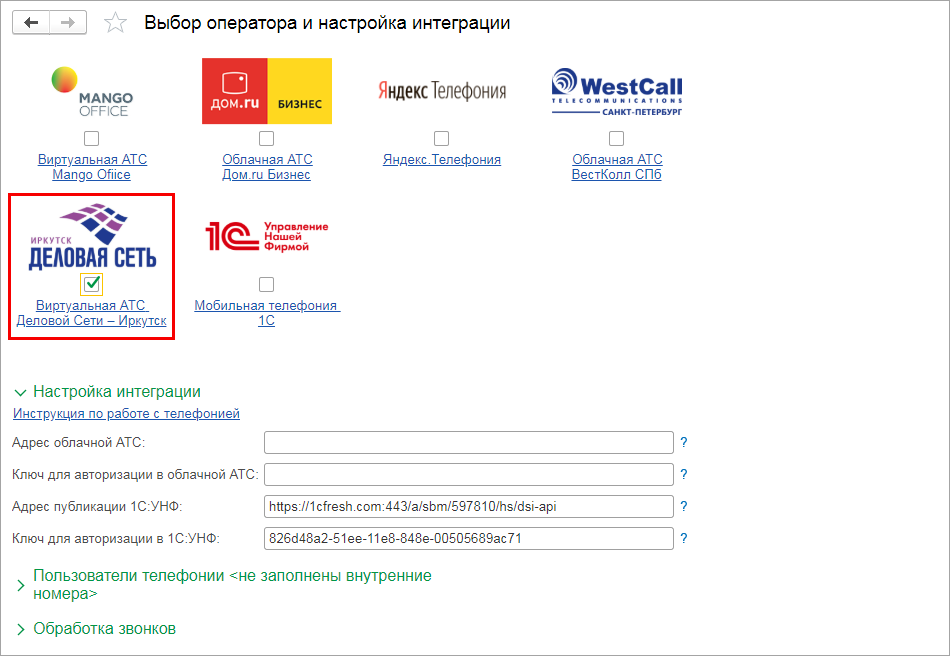 В открывшемся окне выберите виртуальную АТС Деловой Сети – Иркутск, установив флажок. Станут доступны настройки интеграции.