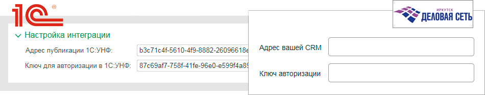 Данные для заполнения можно получить в личном кабинете виртуальной АТС Деловой Сети – Иркутск. Откройте личный кабинет и перейдите в меню Настройки - Интеграция с CRM - 1С:Управление нашей фирмой.