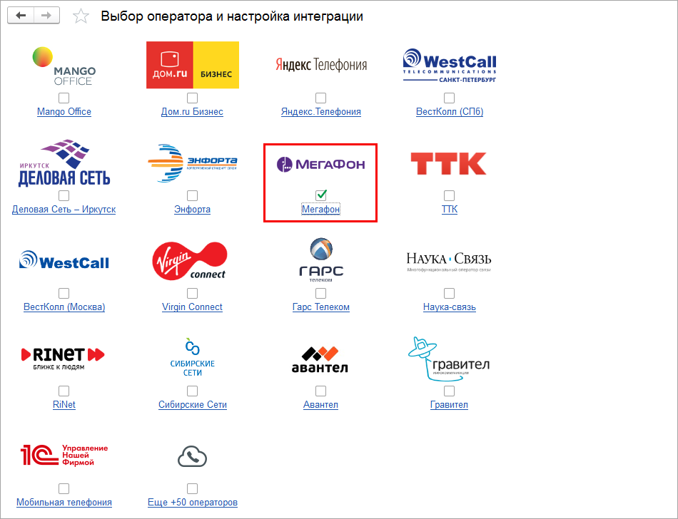 В открывшемся окне выберите виртуальную АТС Мегафон, установив флажок.