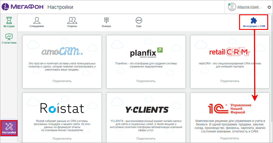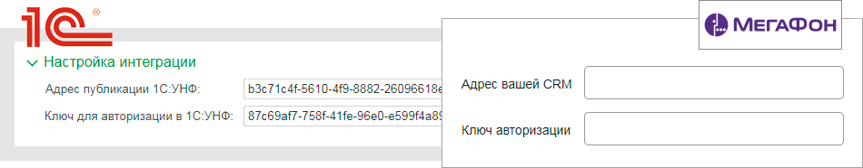 Данные для заполнения можно получить в личном кабинете виртуальной АТС Мегафон. Откройте личный кабинет и перейдите в меню Настройки - Интеграция с CRM - 1С:Управление нашей фирмой.