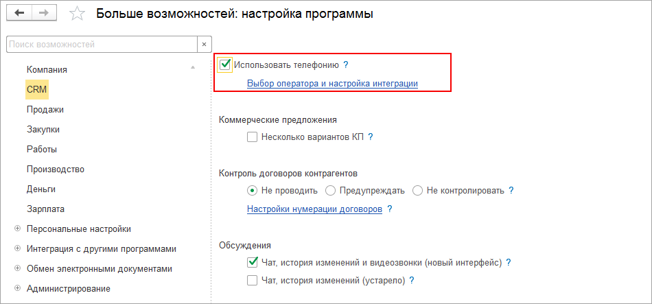 При выборе оператора автоматически будет включена опция Автоматическая обработка звонков (группа настроек Обработка звонков) и подключен сервис Обсуждения.