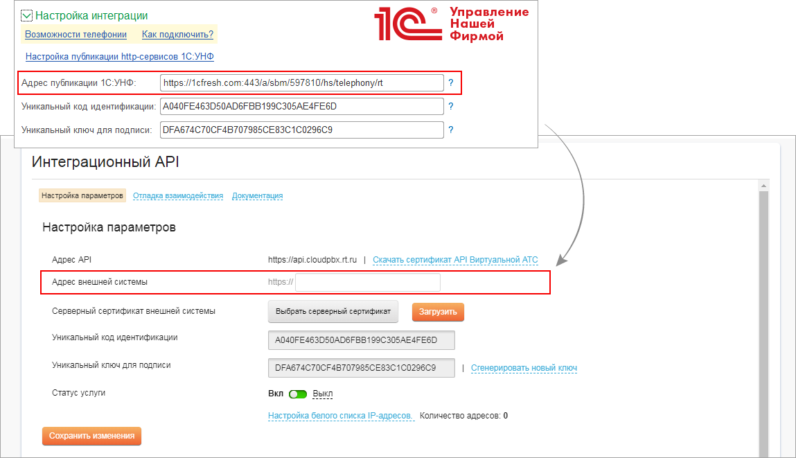 Скопируйте данные из полей Уникальный код идентификации и Уникальный ключ для подписи и вставьте в соответствующие поля в 1С:УНФ.