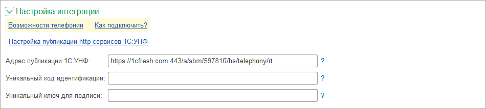 Заполнение настроек пользователей телефонии обязательно для соединения с облачной АТС. Данные о пользователях в 1С:УНФ должны соответствовать данным, указанным в личном кабинете оператора.