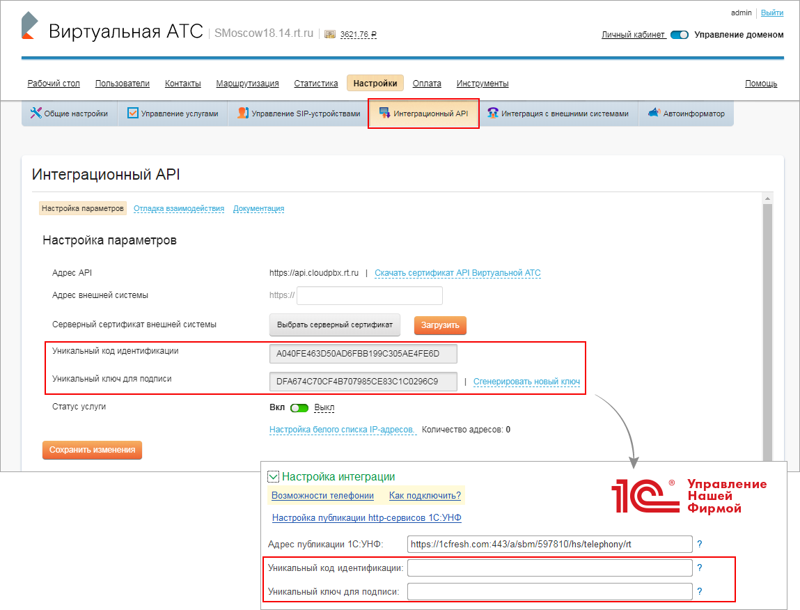 Откройте личный кабинет и перейдите в меню Настройки - Интеграционный API (https://cloudpbx.rt.ru/domain/settings/universal_api/).