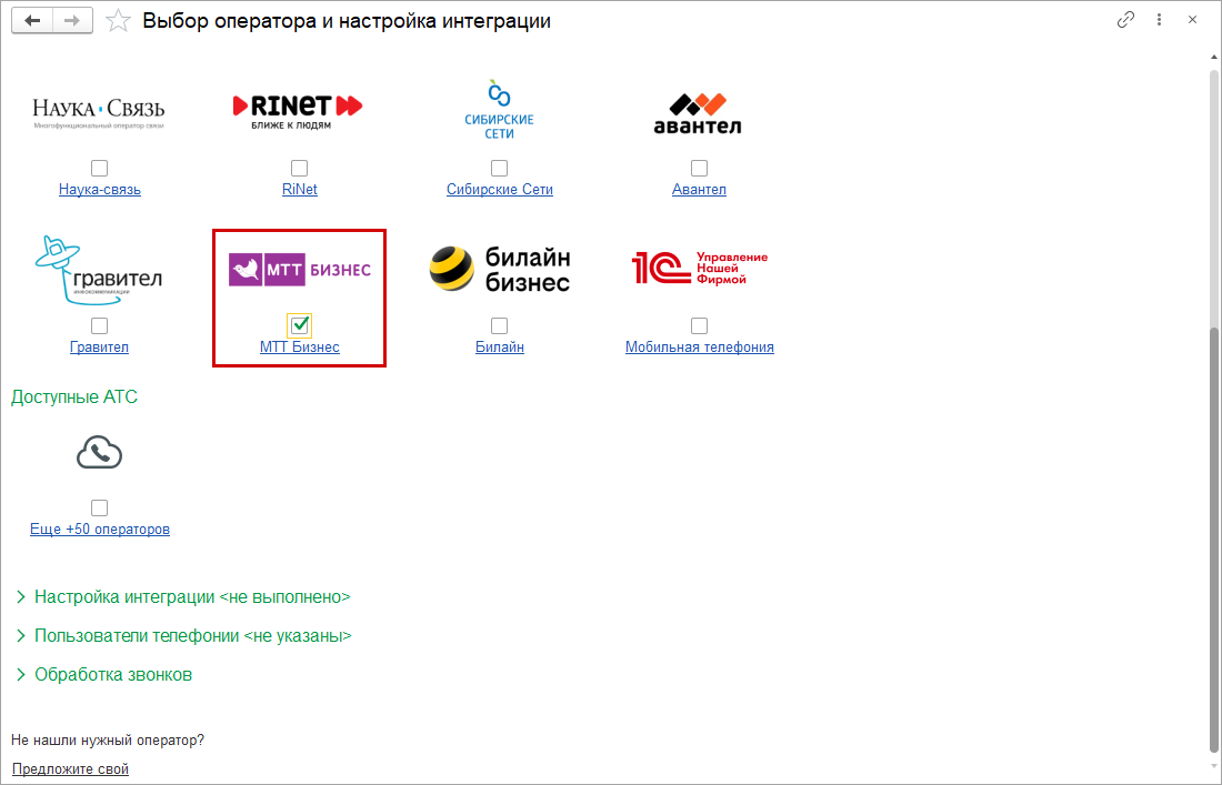 При выборе оператора автоматически включится настройка Автоматическая обработка звонков (группа настроек "Обработка звонков") и запустится подключение к сервису Обсуждения.