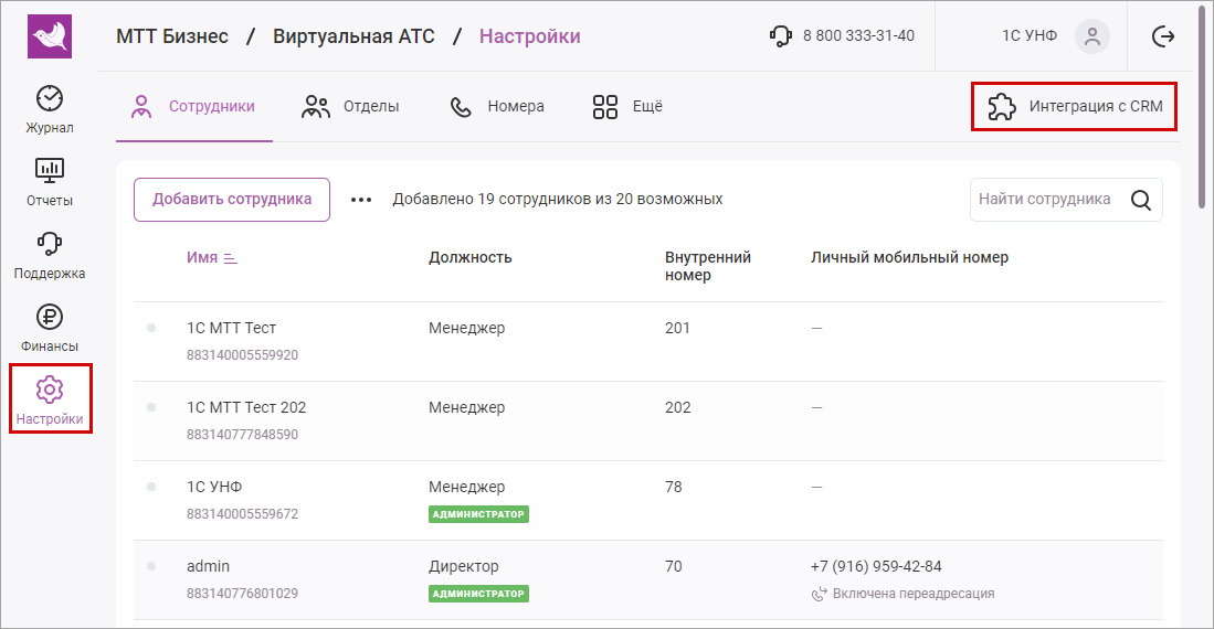 Откройте личный кабинет виртуальной АТС МТТ (https://vpbx.mtt.ru/) и перейдите в меню Настройки - Интеграция с CRM.