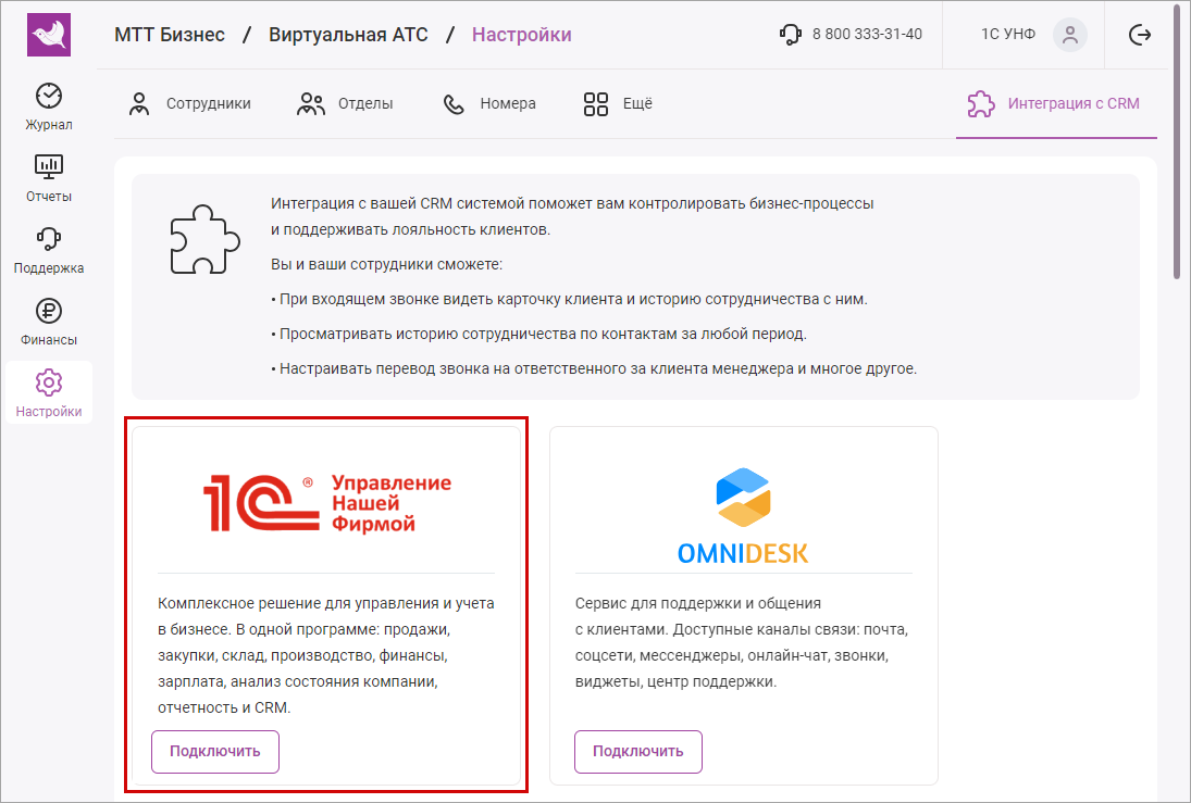 Заполнение настроек пользователей телефонии обязательно для соединения с облачной АТС. Данные о пользователях в 1С:УНФ должны соответствовать данным, указанным в личном кабинете оператора.