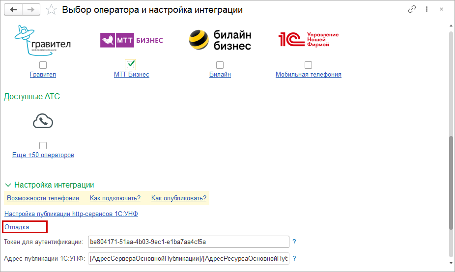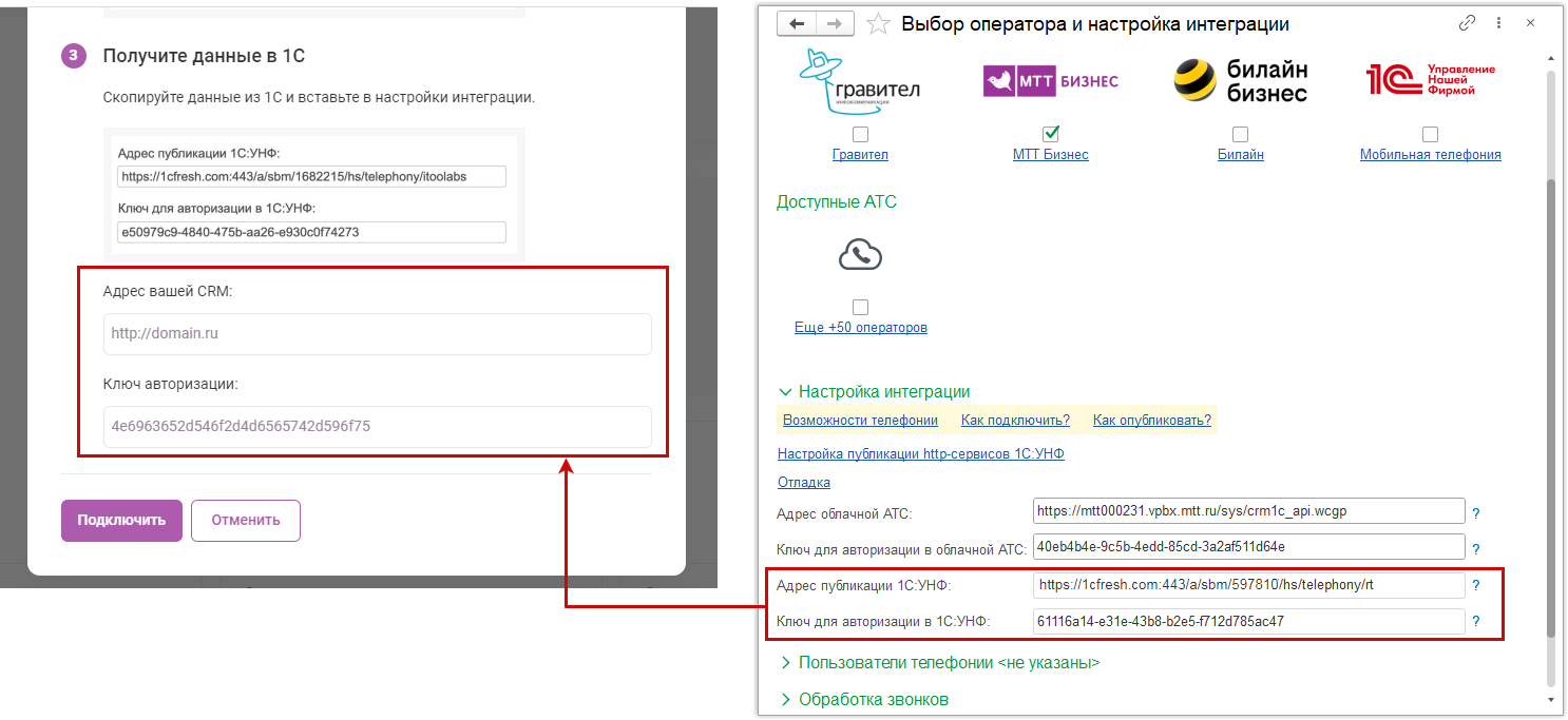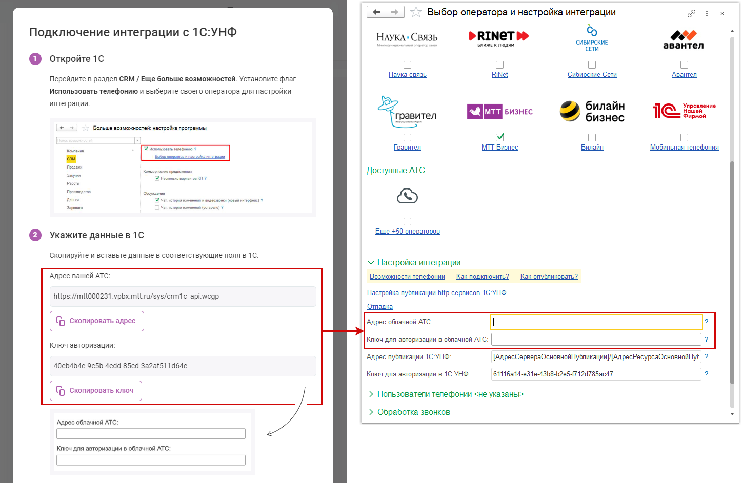 Откроется инструкция оператора по подключению. Из шага 2 скопируйте "Адрес вашей АТС" и "Ключ авторизации", вставьте в соответствующие поля в 1С:УНФ.
