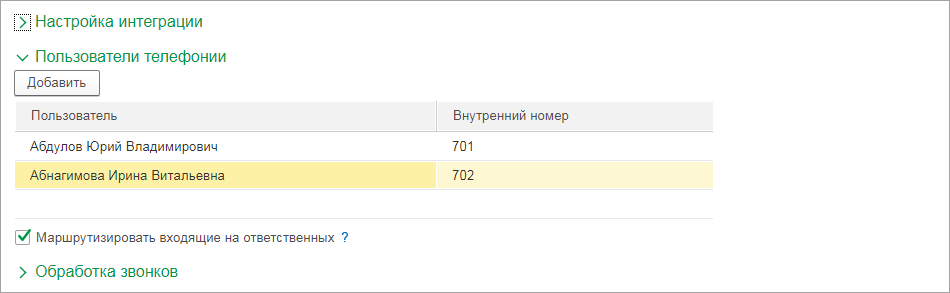 Чтобы входящие звонки клиентов сразу перенаправлялись ответственному за абонента сотруднику, установите в настройках пользователей телефонии флажок Маршрутизировать входящие на ответственных.