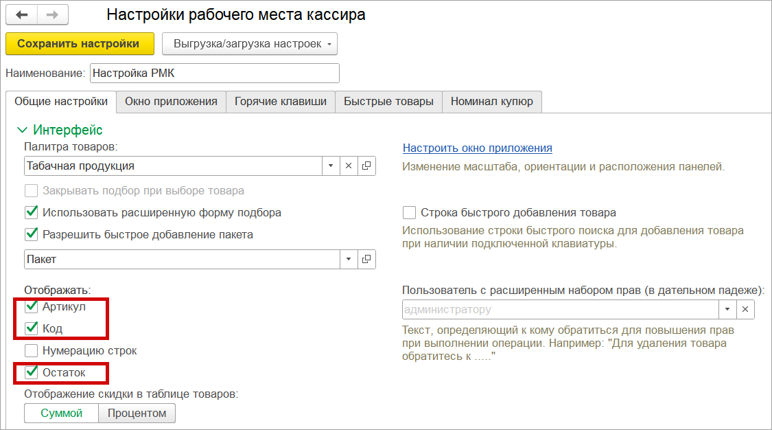 Для подключения возможности перейдите в раздел Настройки - Поддержка оборудования - Настройки РМК. На закладке "Общие настройки" в блоке интерфейс установите флажки "Артикул" или "Код" и "Остаток".