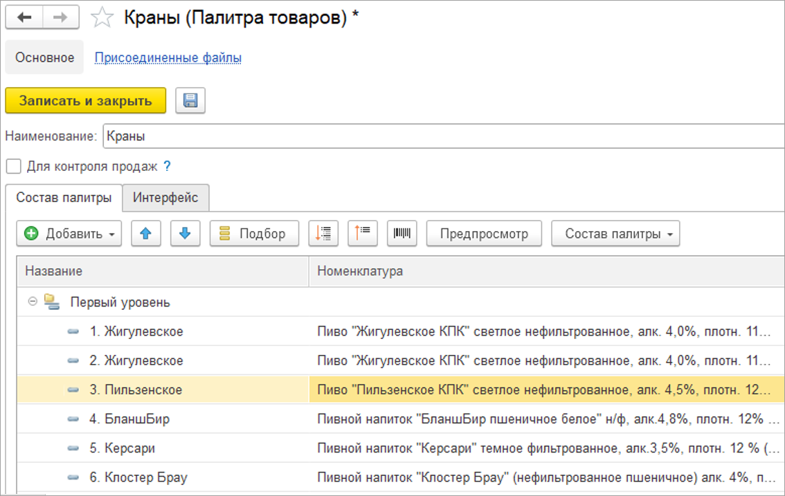 Создайте палитру товаров с пивом. На закладке "Состав палитры"  внесите  краны. Подробно описали создание палитры в статье.
