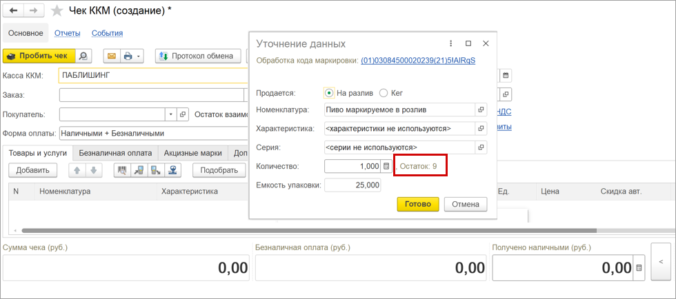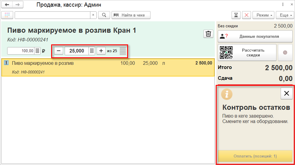 Программа предупредит, если перед пробитием чека количество к списанию превысит остаток. Кассиру потребуется подключить новую упаковку. Если остаток продукции ниже "0", то код маркировки автоматически становится неактивным и больше не участвует в подборе. При этом пустой кег будет отключен автоматически.