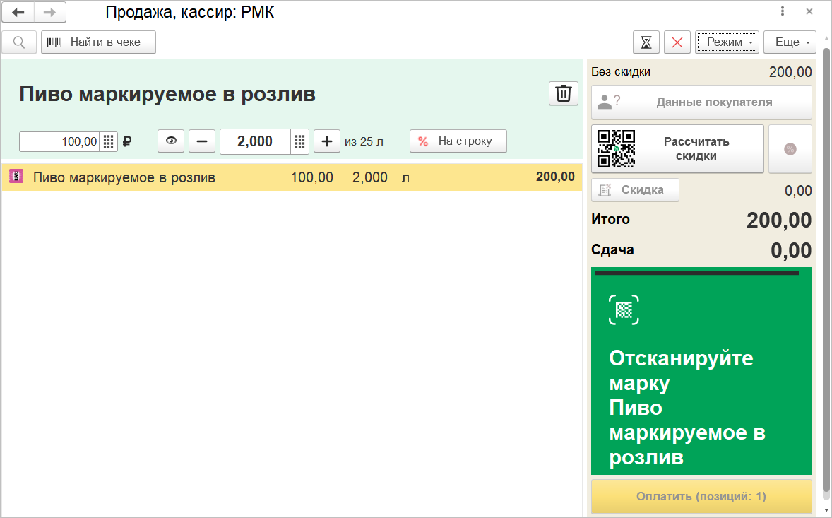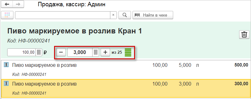 Для оформления розничной продажи используется номенклатура с признаком "В розлив". Подбирать товар можно вручную или сканированием штрихкода ean, при этом кассиру потребуется указать продаваемое количество. Справа от количества будет отображаться объем тары.