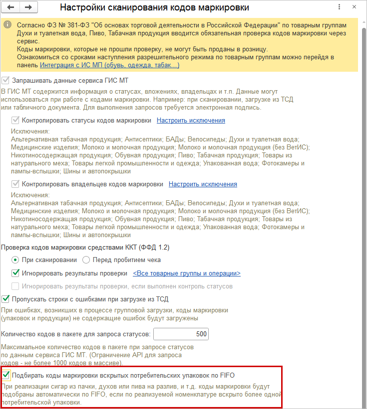 Для старого РМК и Чека ККМ можно настроить списание кодов маркировки частично выбывающей продукции методом FIFO: "первым пришел — первым ушел". Для подключения возможности установите флажок "Подбирать коды маркировки вскрытых потребительских упаковок по FIFO" в разделе "Настройки" – "Интеграция с ИС МП" – "Настройки сканирования кодов маркировки".
