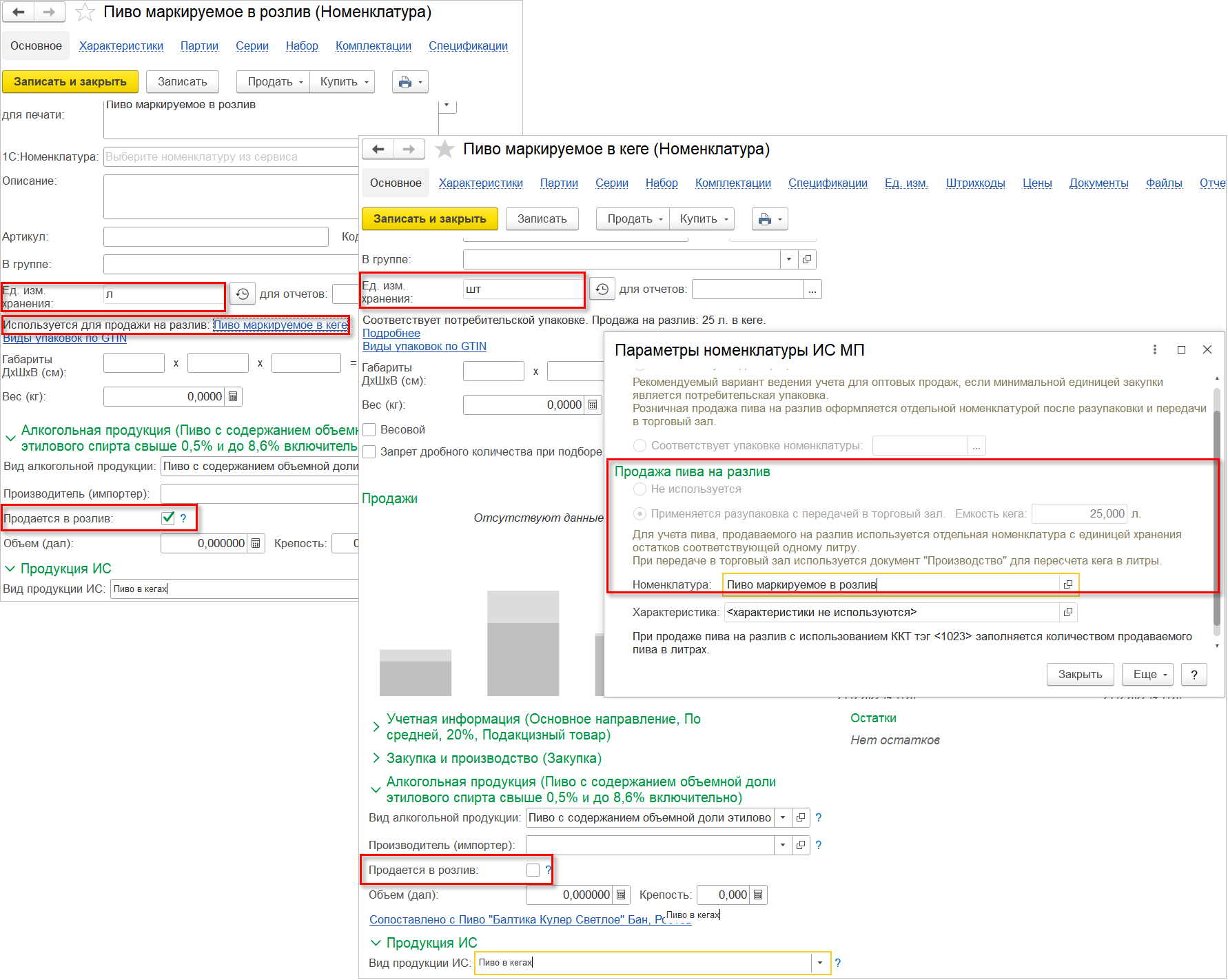 Далее для данной категории рекомендуется создать две карточки номенклатуры. Первую – для регистрации розничных продаж пива в розлив, с единицей измерения "литры" и признаком "Продается в розлив". Вторую - для отражения оптовых операций в пивных кегах, с единицей измерения "штуки" и без признака "Продается в розлив". Здесь же по одноименной ссылке нужно настроить соответствие с потребительской номенклатурой, созданной на предыдущем шаге. После сохранения данных информация о сопоставлении отобразится и в первой карточке номенклатуры.