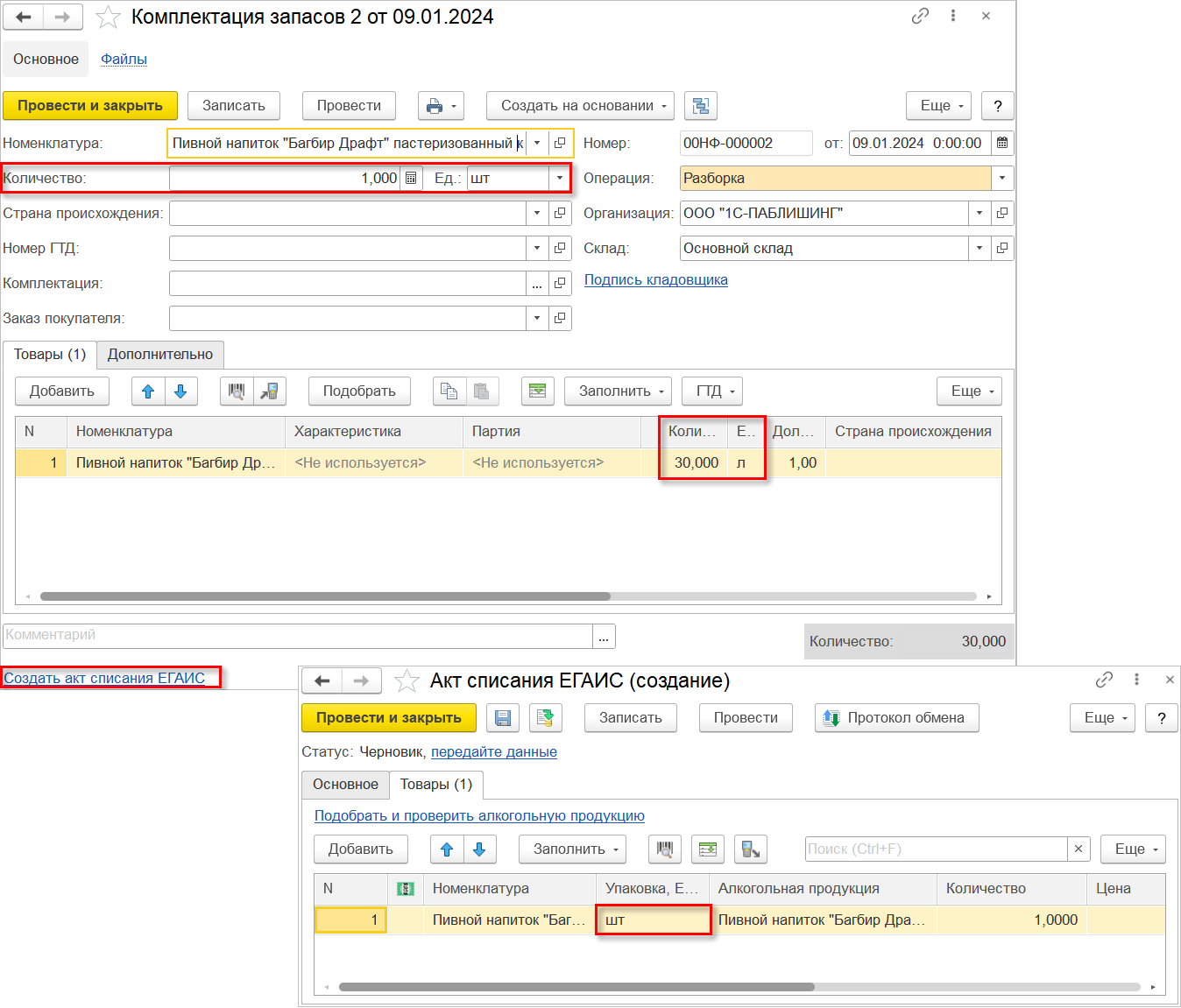 После получения входящего электронного УПД от поставщика в созданном документе "Приходная накладная" потребуется считать марки полученных кегов. Факт вскрытия тары отражается документом "Комплектация запасов". Здесь нужно списать кеги в шт. и оприходовать номенклатуру, продаваемую в розлив в литрах. При проведении документа автоматически сформируется гиперссылка "Создать акт списания ЕГАИС", предназначенная для отражения выбытия алкогольной продукции.