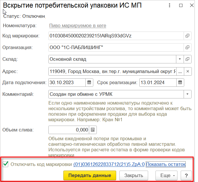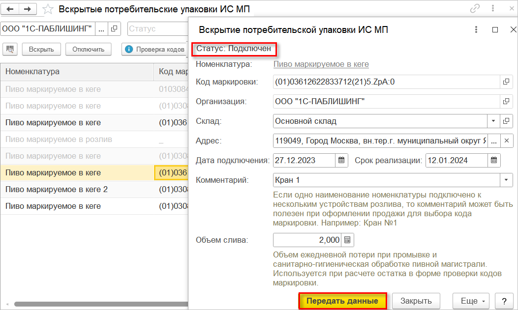 После этих действий код маркировки перейдет в статус "Подключен", и с этого момента его уже можно использовать для оформления продаж. После подключения кега пользователю потребуется передать отчёт о подключении в ГИС МТ с помощью одноименной команды меню "Действия" в общем списке или кнопки "Передать данные" в самом документе.