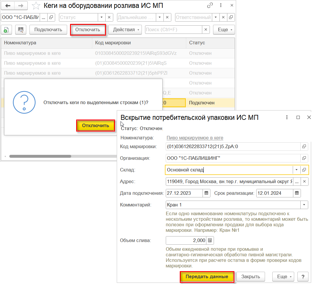 Отключить кег от крана можно автоматически при регистрации подключения нового кега или вручную, воспользовавшись командой "Отключить" в списке документов "Кеги на оборудовании розлива ИС МП". При этом потребуется указать конкретный кег, если подключено несколько, а затем передать данные в ГИС МТ.