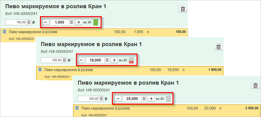 При продаже одного и того же сорта пива для каждой строки будет отображаться актуальный остаток с учетом данных корзины. На рисунке ниже из кега емкостью 30 л. сначала налили 5 литров, а потом еще 3 литра, поэтому для второй строки отображается остаток 25 л., уже с учетом первой строки. И наоборот, остаток для первой строки будет равен 27 л.