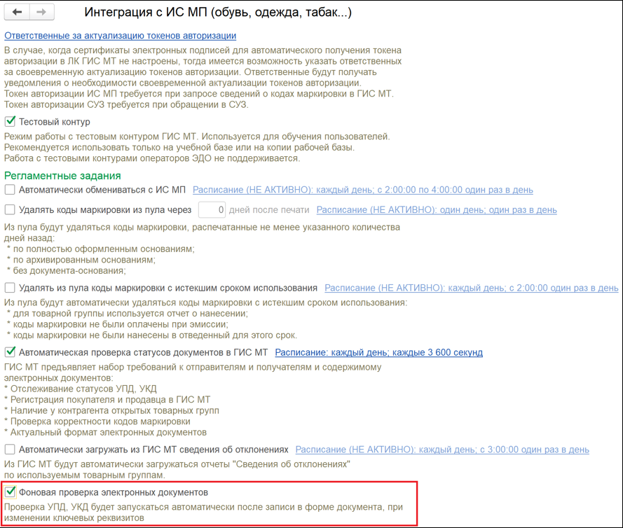 Если в настройках интеграции с ГИС МТ включена опция "Фоновая проверка электронных документов", то при проведении документа автоматически выполняется проверка данных на соответствие требованиям ГИС МТ.