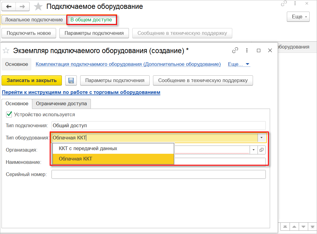 Создаем новое оборудование с типом - Облачная ККТ в разделе: Настройки - Поддержка оборудования - Подключаемое оборудование. Оборудование можно создать только в режиме "В общем доступе", так как оно не привязано к рабочему месту и физическому месту фискализации.