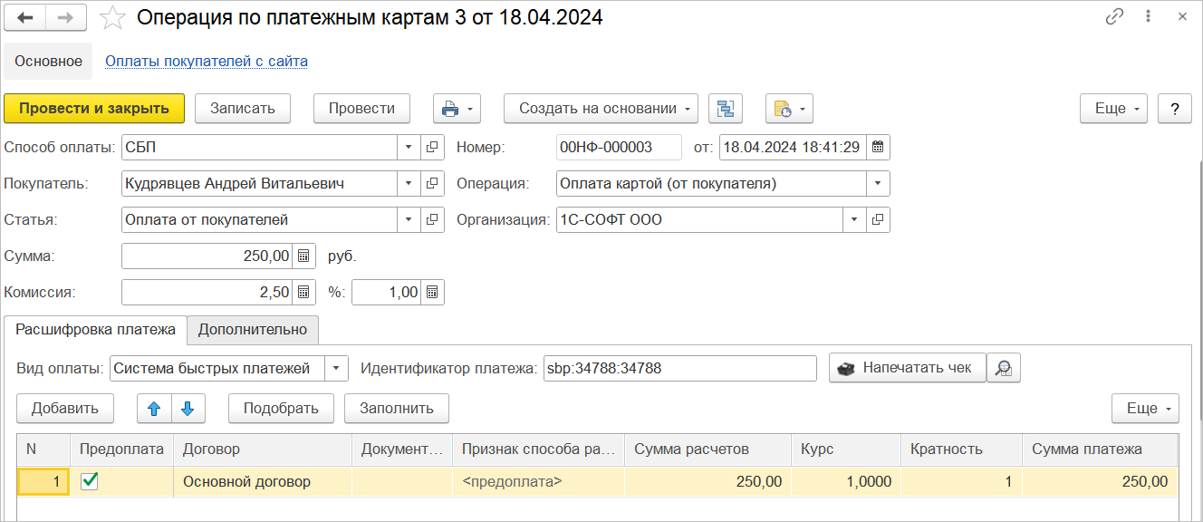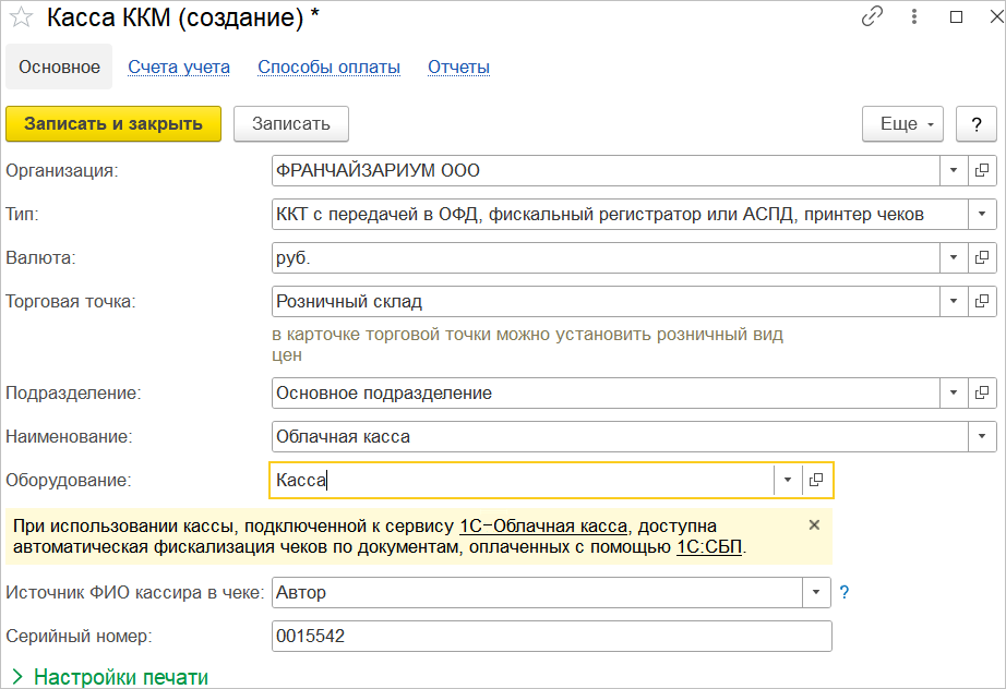 Сейчас в программах 1С:Розница и 1С:УНФ сервис 1С-Облачная касса работает в автоматическом режиме при приеме оплат через Систему быстрых платежей (1С:СБП).