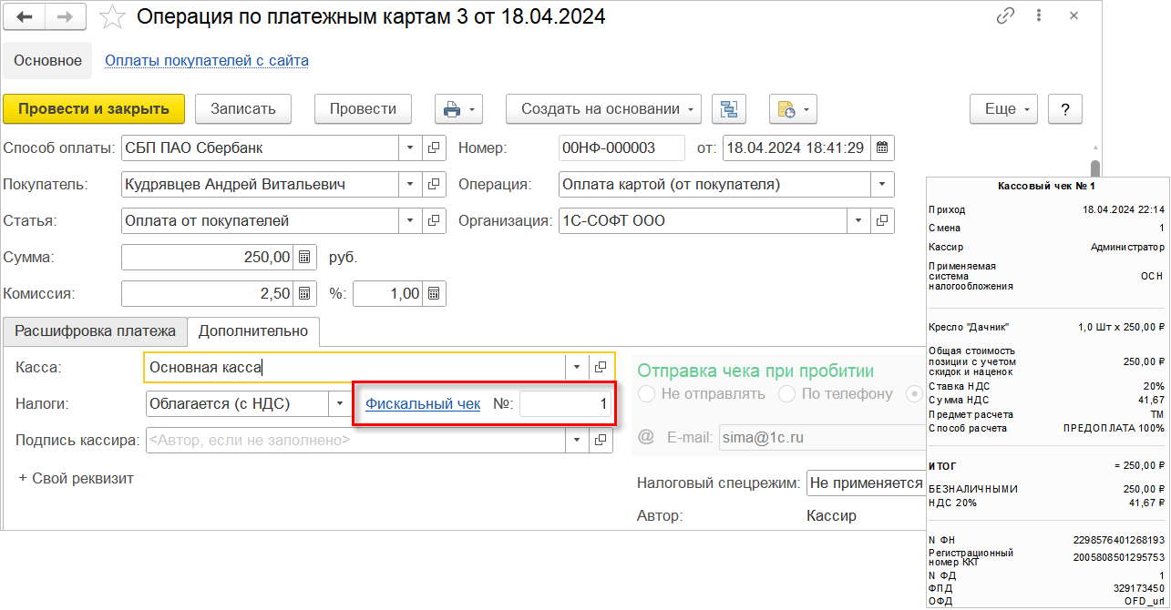 После оплаты программа "1С" отправляет данные чека в облачную кассу, в которой автоматически происходит фискализация. Чек в электронном виде отправляется покупателю. В программу загружается результат пробития чека кассой.