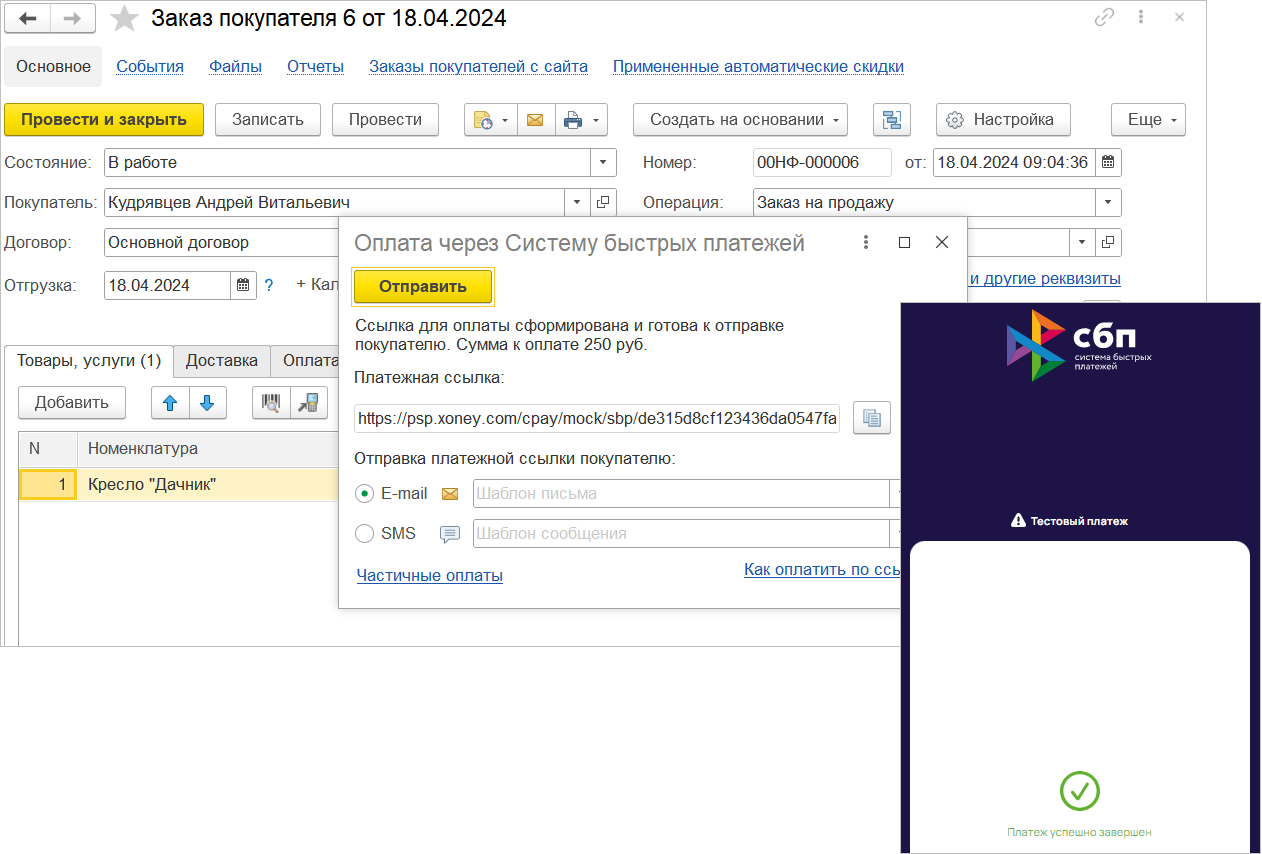 В программе создаем документ "Заказ покупателя" и высылаем ссылку для оплаты с помощью СБП. Как подключить и использовать платежи с помощью СБП можно прочитать в статье.
