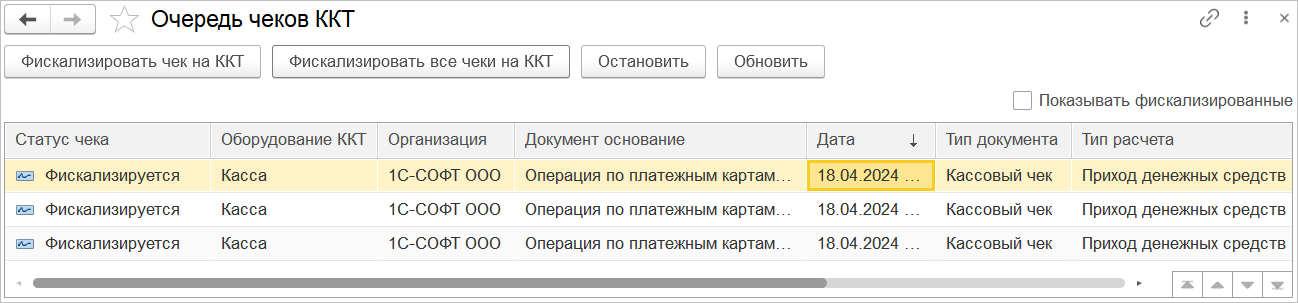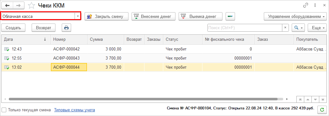 Созданные документы отобразятся в общем списке с отбором по облачной кассе.