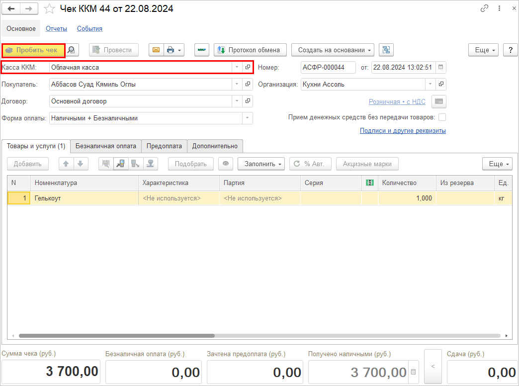 (актуален с версии 3.0.9) В открытой кассовой смене из списка документов "Чеки ККМ" создаем новый документ, заполняем данные о продаже, выбираем способ оплаты и пробиваем чек стандартным способом. При этом данные будут переданы в сервис облачных касс.